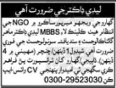 Lady Doctor Required at NGO Sindh 2025. A reputable NGO in Karachi is seeking applications from qualified female candidates for the position of Lady Doctor (MBBS).
